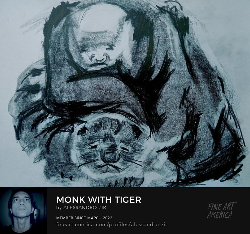 "Monk with Tiger", A/Z's Graphite & Pencil Drawing of a Medieval Chinese handscroll (original image: Two Minds in Harmony, in the manner of Shi Ke), available with other drawings and photographs at Fine Art America;